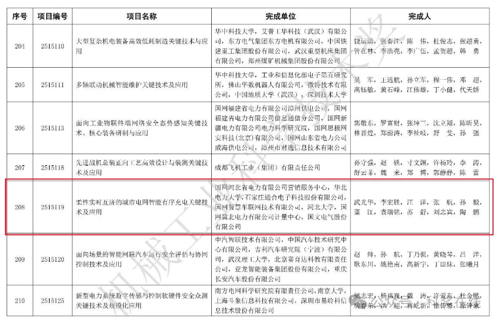 2025年度“机械工业科学技术奖”评审工作已完成,评出拟授奖项目向社会进行公示。国文电气股份有限公司联合国网河北省电力有限公司营销服务中心、华北电力大学、石家庄通合电子科技股份有限公司、国网智慧车联网技术有限公司、河北大学、国网冀北电力有限公司计量中心申报的《柔性实时互济的城市电网智能有序充电关键技术及应用》获得科技进步奖二等奖。